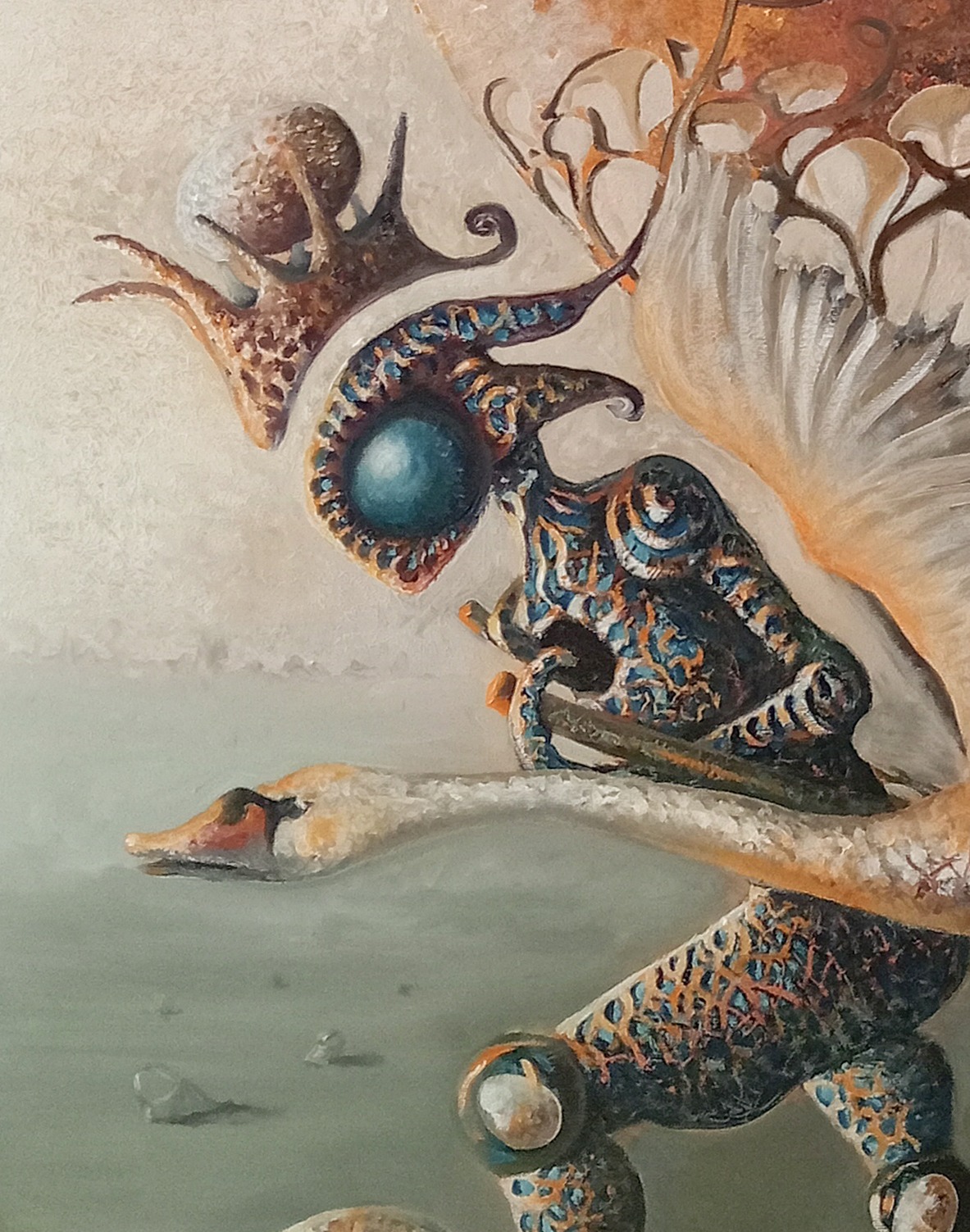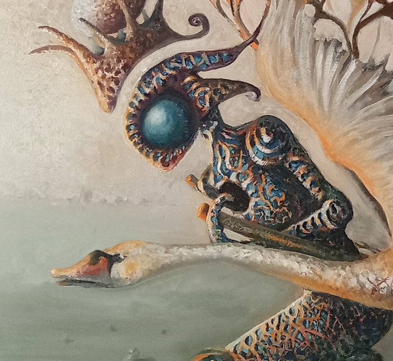 I also use the image of the egg as a symbol of new life and the unknown, feathers as a quiet presence of inner calm, and keys or locks as traces of an ongoing search for meaning, something we are often drawn into without fully understanding
